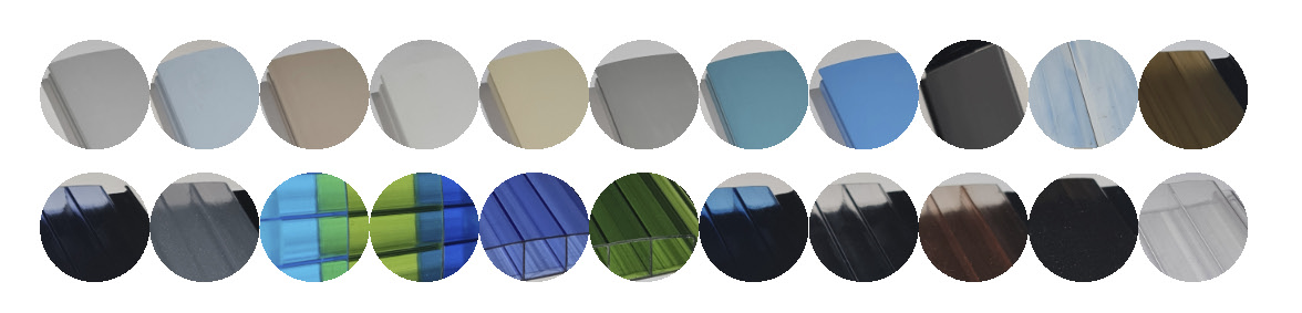 Sonnenfalle aus Polycarbonat. In den Farben transluzent, transluzent-schwarz, und transluzent-bläulich erhältlich. Es wird keine Verkleidung benötigt, Extrem schlagfest, hagelsicher bis zu einer Körnergrösse von bis zu 30 mm, gute mechanische Eigenschaften.